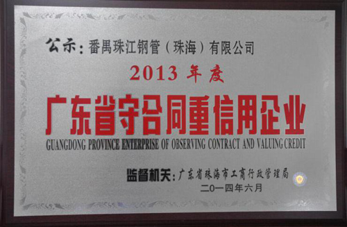 近日,珠江钢管珠海公司被评定为2013年度“广东省守合同重信用企业”,这是我司首次获得此荣誉称号。