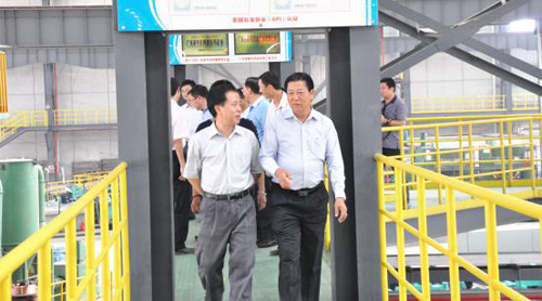 广东省委常委、珠海市委书记李嘉(左一)到珠海公司视察,珠江钢管集团董事局陈昌主席(右一)陪同,介绍企业发展现状及前景。